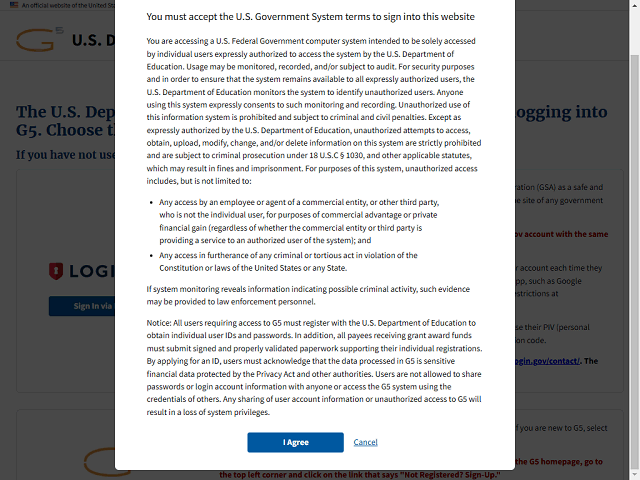 Click the I Agree button to agree to the terms and open the Login.gov homepage.