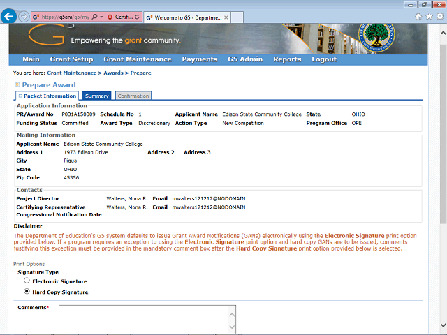 Note:  The Signature Type defaults to Electronic Signature. To issue a GAN in hard copy users must select the "Hard Copy Signature" option.  Selecting the "Hard Copy Signature" option will require users to enter a comment justifying their decision to override the default.  Print Options all default as checked.  You may uncheck the box for attachments, payee verification and mailing label as needed.