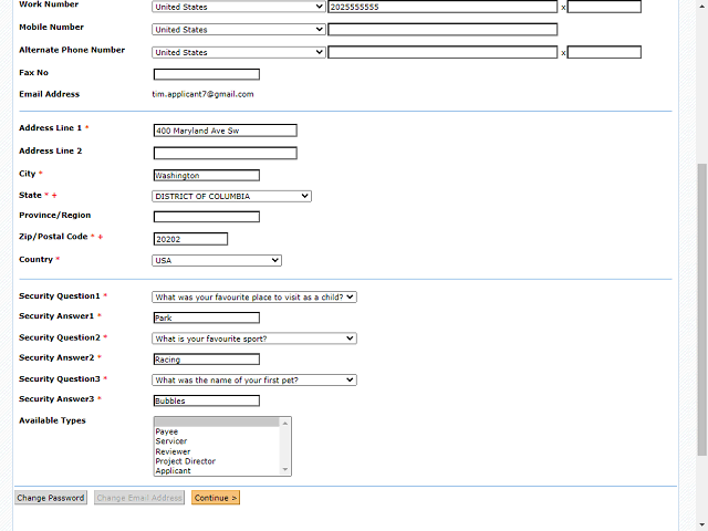 Note:  You may update any of the fields which are active.  To change your password, you can click the Change Password button.