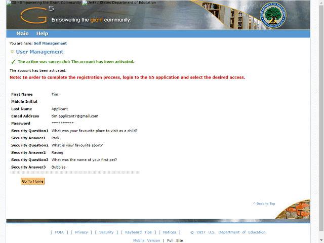 The system displays a message indicating that the account has been activated and that you will need to log into G5 to select your role for access. You will also receive a confirmation email.