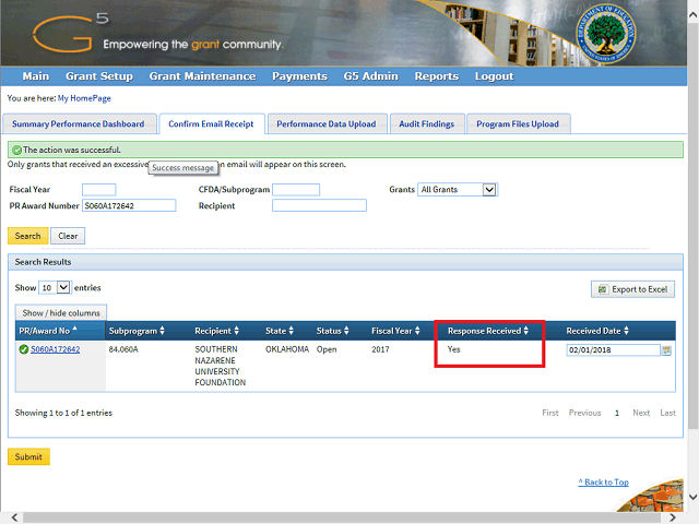Under the Response Received field the system will flag the award as Yes/No in the database and display it here.
