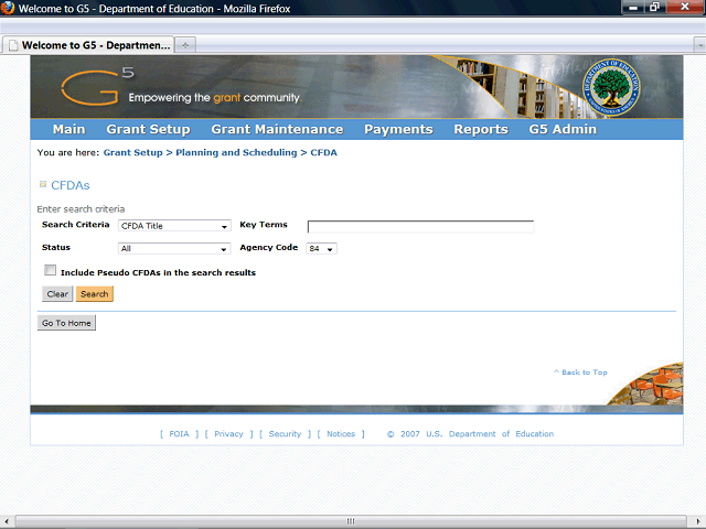 CFDA Number: enables you to search the CFDA number of the program you wish to access. The CFDA number is assigned by G5 after the A-89 representative approves the CFDA program